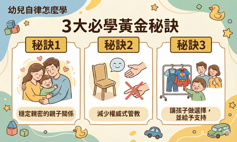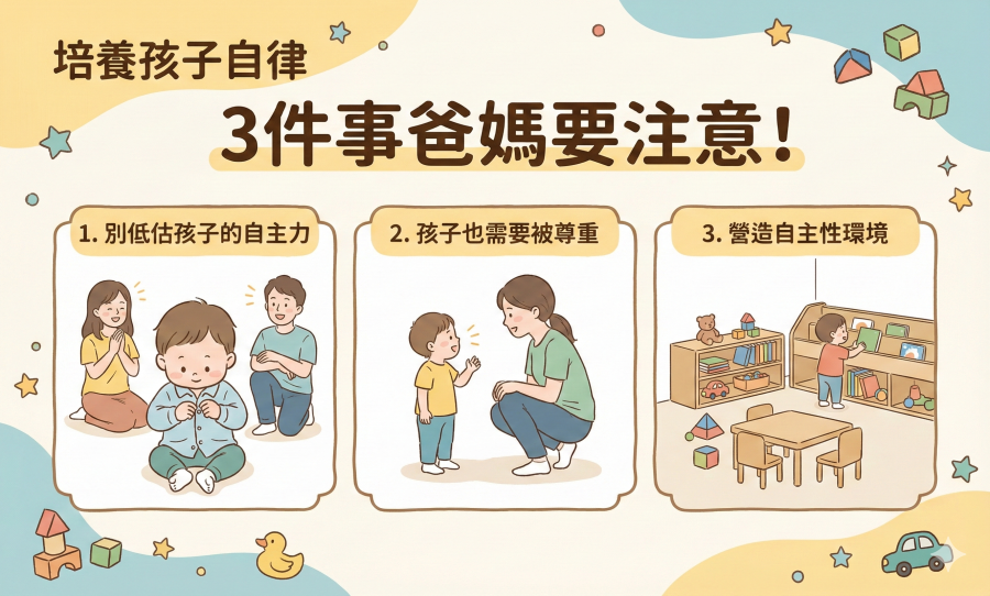 3. 營造有自主性的成長環境:父母越願意放手,在安全範圍內讓孩子自主探索,孩子就越早培養出自律,給孩子越大的自主空間,換來的是他們更強的內在規範能力和自信心。