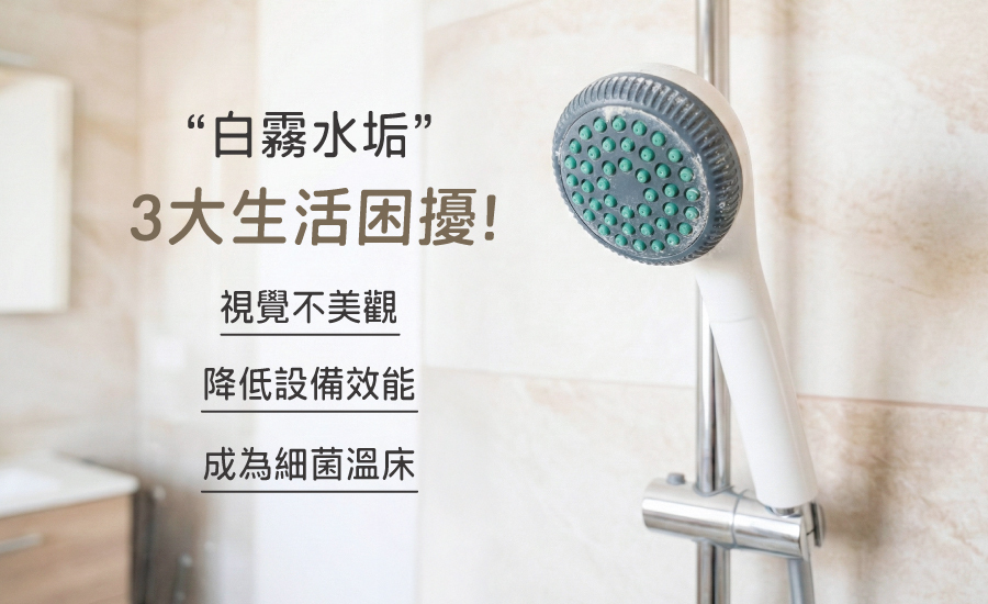 別小看這層看似不起眼的白色水垢,它會帶來不少生活上的困擾。首先是「視覺不美觀」,當水分蒸發後,礦物質就留在表面,日積月累下設備覆蓋白霧霧的水垢,變得暗沉失去光澤,看起來舊舊髒髒,就算再怎麼勤勞打掃,還是給人一種沒洗乾淨的感覺;其次是「降低設備效能」,水垢累積還可能影響家中設備效能,管線內的水垢縮小了通道,減少水流、水壓,淋浴蓮蓬頭如果被水垢堵住噴嘴,洗澡水流會明顯變小。最後是「成為細菌溫床」,水垢表面凹凸不平,容易藏汙納垢成為細菌滋生溫床,例如馬桶黃垢、浴室黑斑霉垢,有些就是水垢混合尿鹽或肥皂垢形成。水垢的困擾從視覺美觀、清潔難度到設備功能都有影響,一般家用清潔劑也無法對付它,的確讓人非常困擾。