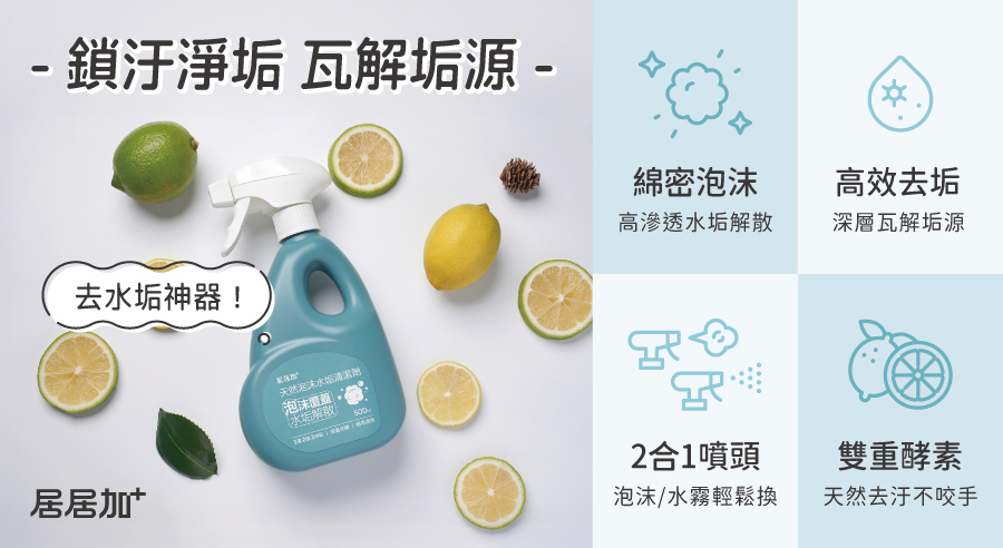 想要輕鬆有效的去水垢,當然要有得力的好幫手!市面上去水垢的商品不少,但居居加的天然泡沫水垢清潔劑很不一樣,它的配方是天然來源,採用檸檬、柑橘雙重酵素,不含強酸成分,卻能有效分解頑固水垢,使用時沒有刺鼻味,使用後肌膚也不會乾癢,這點對家中有長輩、小孩或敏感肌的人來說特別加分!