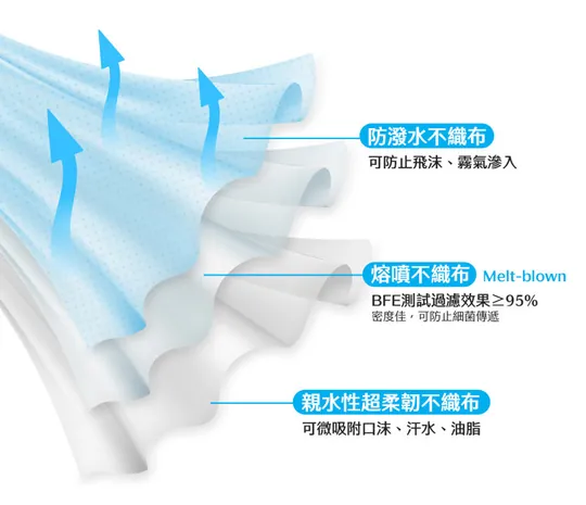 ◆ 中間層-熔噴不織布:最重要的過濾層,是防護功效的關鍵角色,良好的過濾性,可以預防呼吸之間不會有細菌進入。