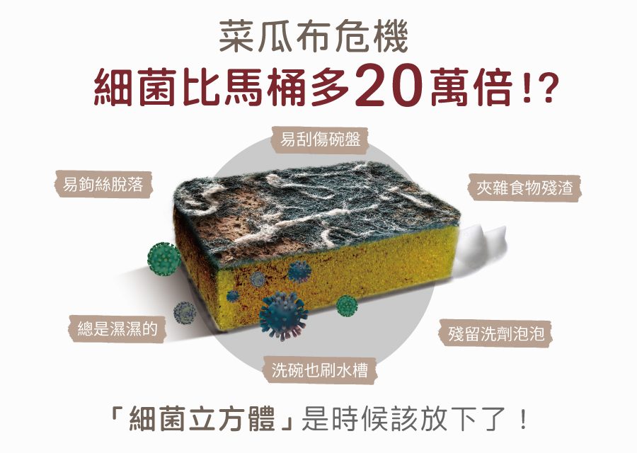 在多數家庭,海綿菜瓜布必幾乎是廚房必備,很吸水又有泡沫,感覺用來清潔餐具最方便不過,但你可能不知道這看似乾淨的海綿菜瓜布其實是細菌最愛的溫床!除了德國微生物學家的研究,英國《每日郵報》的一項報導指出,一般家庭用的海綿菜瓜布上驗出的細菌量,居然比家用馬桶高出20萬倍,每一平方英吋就有1000萬個細菌,用這樣的海綿刷完碗盤後,可能還會有上百萬個細菌殘留附著在餐具上。