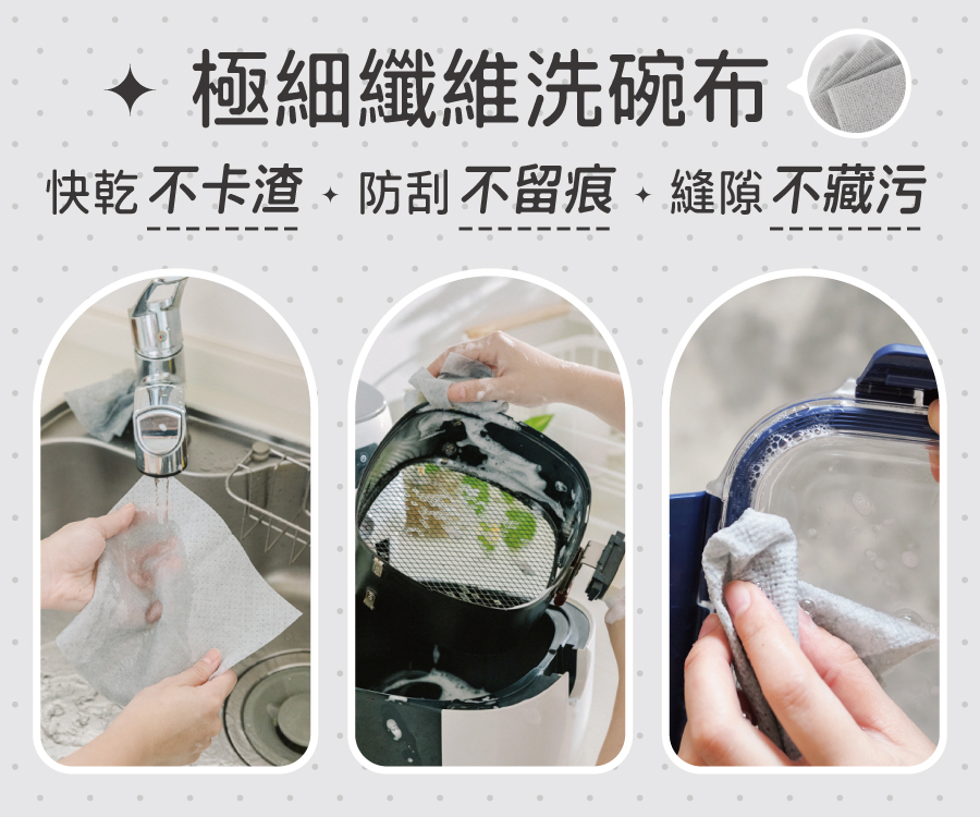 以前洗流理台會用水槽刷、鋼絲球來刷洗,冰箱層架用抹布、膠條溝槽就要用細小刷子來清,抽油煙機、瓦斯爐台也要定期清潔,廚房的清洗工具光準備就累了,換了極細纖維洗碗布之後,不管洗什麼,拿它來用就對了!輕度水垢、髒污直接洗,嚴重一點就搭配清潔劑使用,大面積、小縫隙、平面甚至各種角度都面面俱到,真的做到清潔無死角。