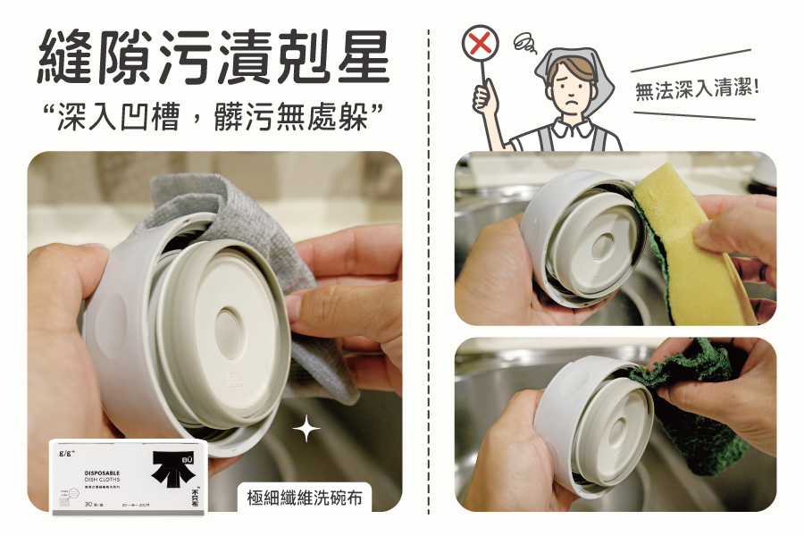 杯蓋、保溫瓶蓋、保鮮盒蓋、水壺瓶口等器具總是有好多凹槽縫隙,這裡卡垢真的很好難清,海綿菜瓜布根塞不進去!這時候你需要薄薄一片的極細纖維洗碗布,因為薄,所以能夠依照需求自由折疊來塑造剛剛好的厚薄度,平常海綿無法洗到的溝槽、縫隙及死角,居居加洗碗布通通可以輕鬆深入,讓污垢再也無處躲藏。相信有潔癖人一定愛不釋手,第一時間推薦給同好分享喜悅,再來就是要囤好囤滿才有安全感。