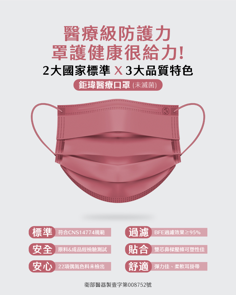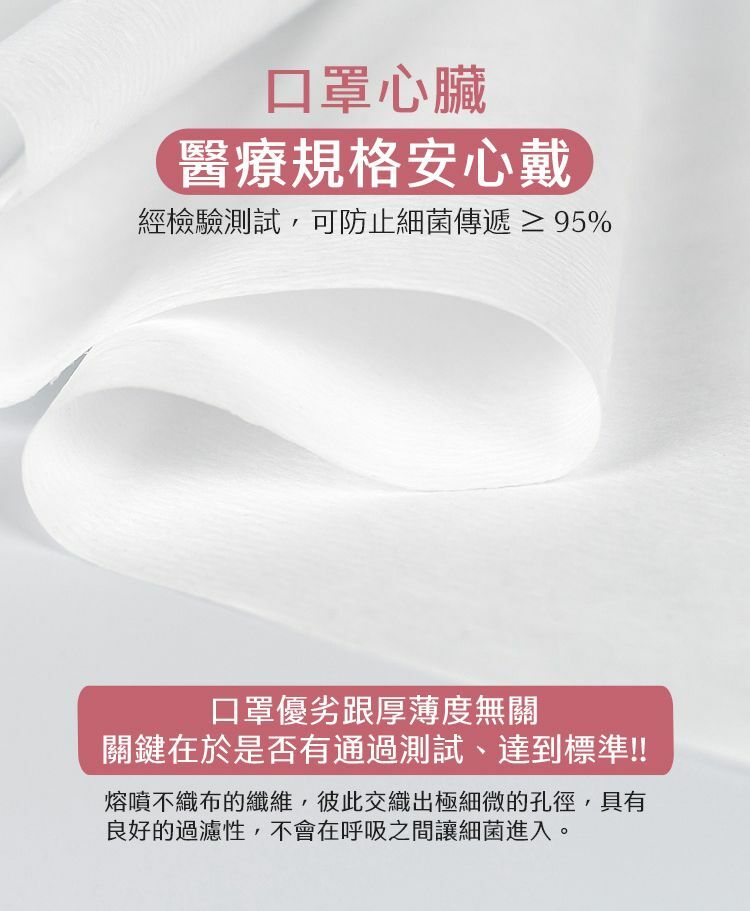 醫療口罩的重點在於過濾性,而中間層為口罩最主要的過濾層,因此口罩的優劣跟厚薄度無關,關鍵在於中間層材質「熔噴不織布」( Melt-blown)是否有通過測試、達到標準。鉅瑋醫療口罩全系列皆符合CNS14774規範,BFE過濾效果≥95%,有效過濾才能確實防護。