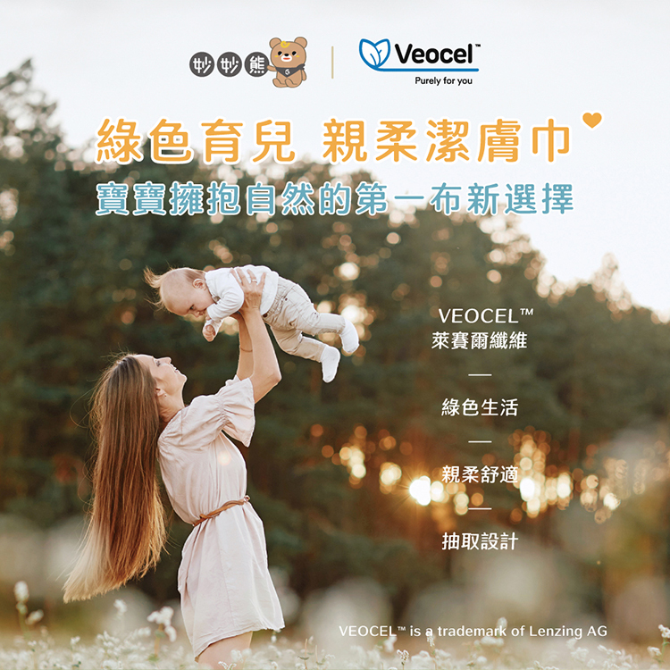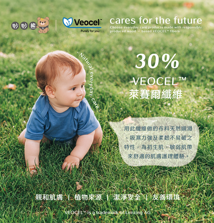 ◆ 30% VEOCEL™萊賽爾纖維,親膚柔順、高吸濕,為初生肌、敏弱肌帶來舒適體驗