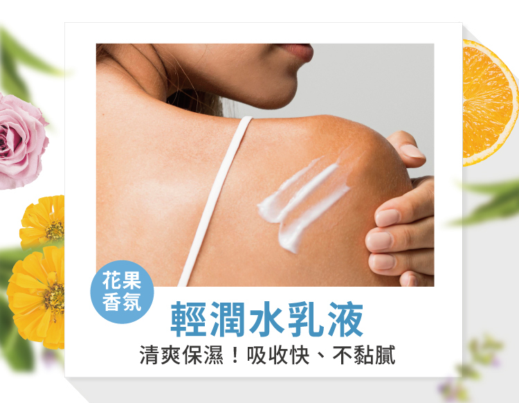 ◆花果香氛,輕潤水乳液,清爽保濕、吸收快、不黏膩,全年適用。