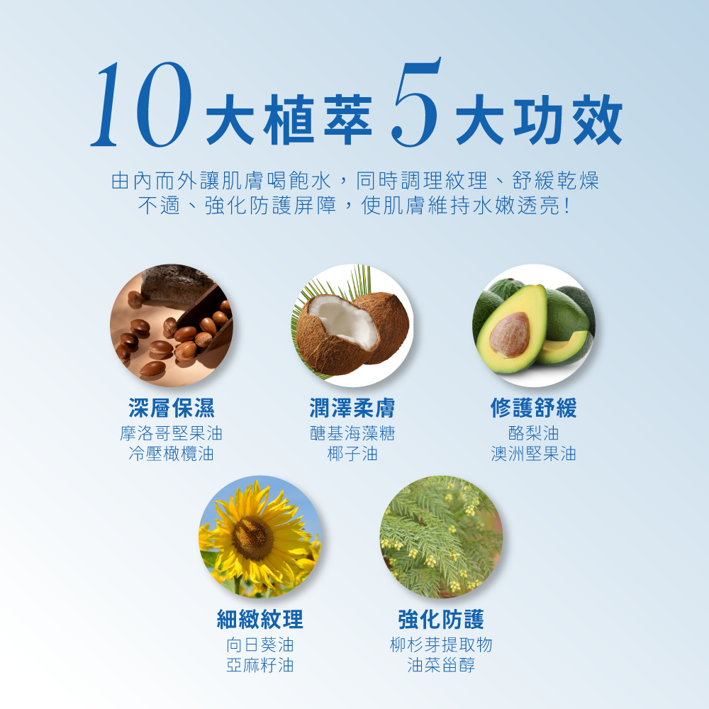 ◆10大植萃5大功效,由內而外讓肌膚喝飽水,同時調理紋理、舒緩乾燥不適、強化防護屏障,使肌膚維持水嫩透亮。