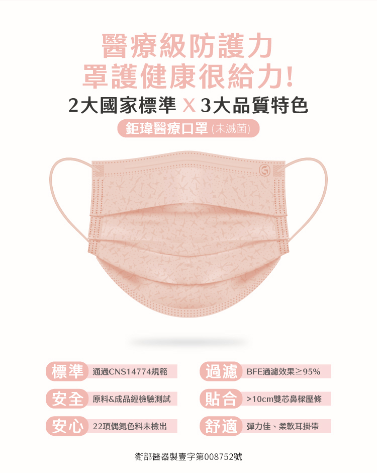 醫療口罩成為全民日常單品後,除了素色口罩,各種設計圖騰的口罩紛紛上市,讓人目不暇及,醫療口罩最重要的防護!因此挑選喜歡的口罩之外,更要確認口罩的BFE過濾效果,以及是否通過偶氮色料的檢驗。鉅瑋醫療口罩符合CNS14774標準,可以安心選購、配戴!