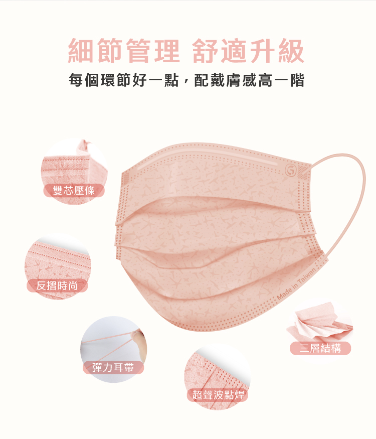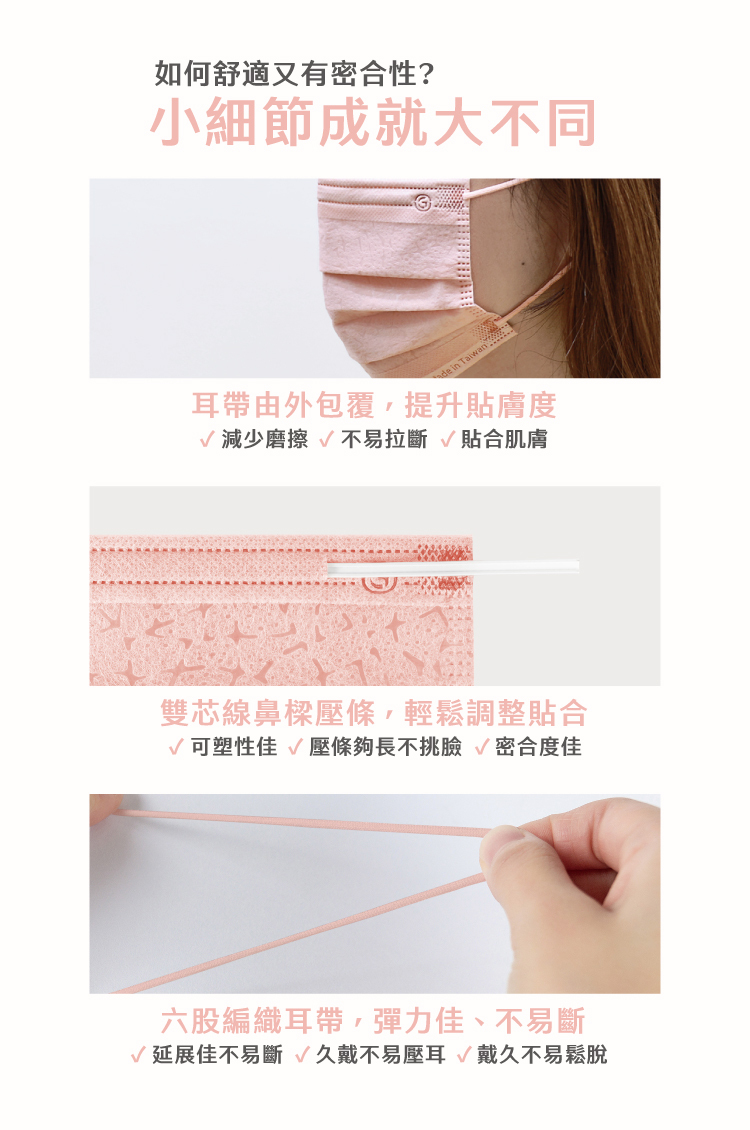 ◎ 口罩舒適度:採用六股編織耳帶,延展佳、彈力佳,久戴不壓耳、不鬆脫