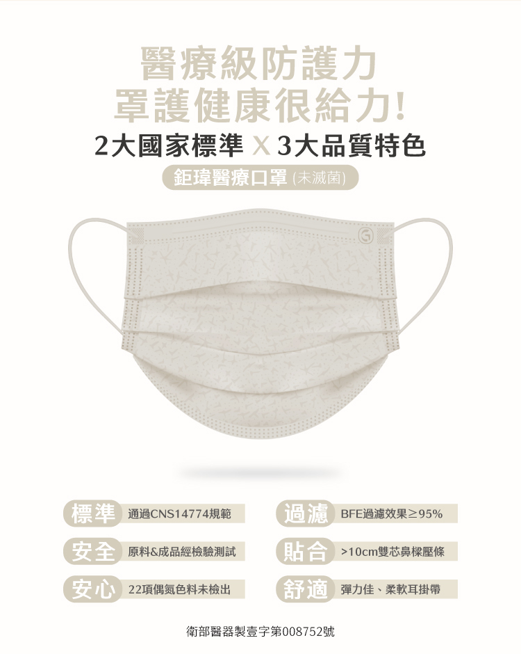醫療口罩成為全民日常單品後,除素色口罩外,各種設計圖騰的口罩紛紛上市,讓人目不暇及,醫療口罩最重要的防護!因此選擇喜歡的口罩之外,更要確認口罩的BFE過濾效果,以及是否通過偶氮色料的檢驗。鉅瑋口罩符合CNS14774標準,可以安心、配戴!