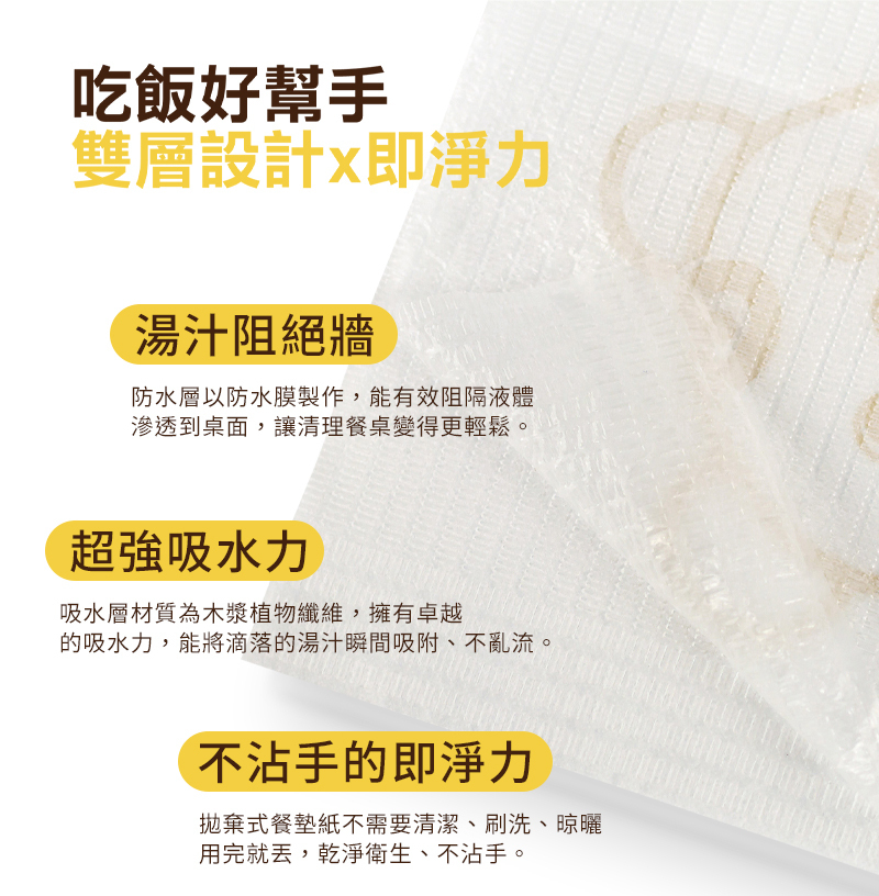◆ 上層吸水、下層防水,快速吸附液體,阻隔湯汁擴散,餐後清潔好簡單