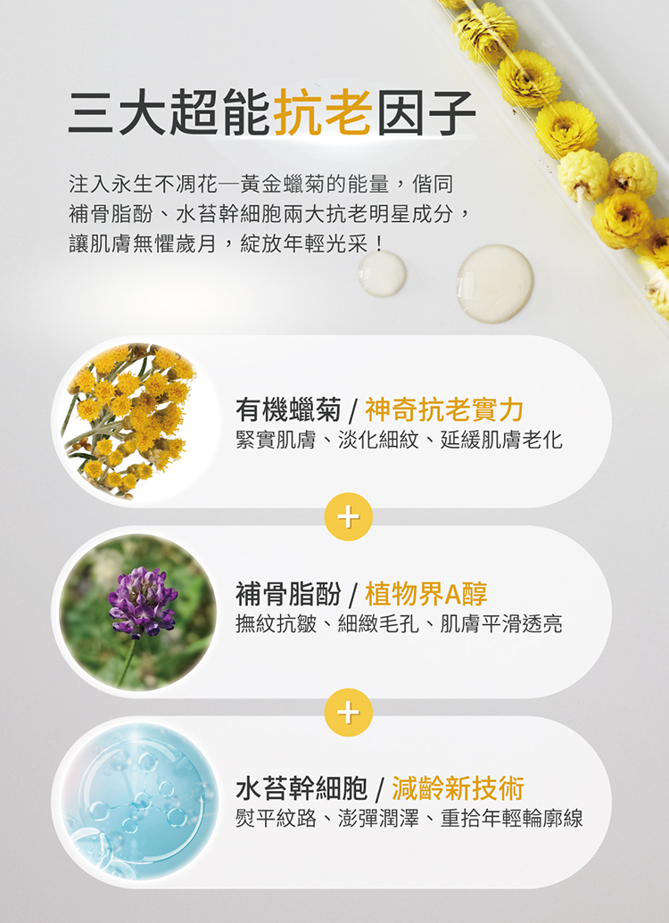 ◆有機蠟菊(永生花):延緩老化、淡化細紋、緊實肌膚,同時修護並強化防禦力。