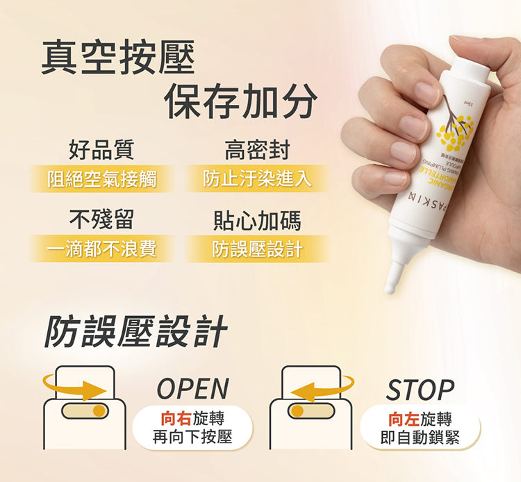 ◆瓶身真空按壓設計,阻絕空氣接觸、防止汙染進入,確保品質保存;更能減少精華液殘留、充分使用。