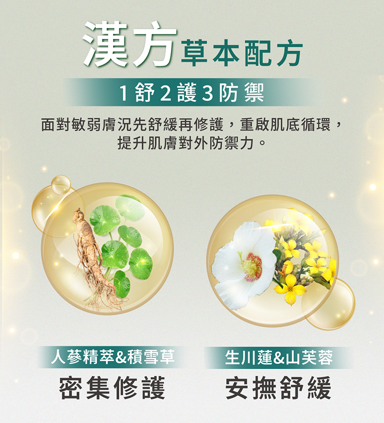 ◆漢方草本配方,面對敏弱膚況先舒緩再修護,重啟肌底循環,提升肌膚對外防禦力