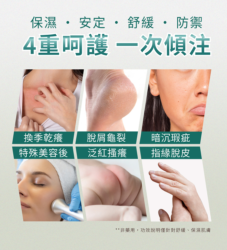 ◆適用於換季乾癢、脫屑龜裂、暗沉瑕疵、泛紅搔癢、指緣脫皮及特殊美容後