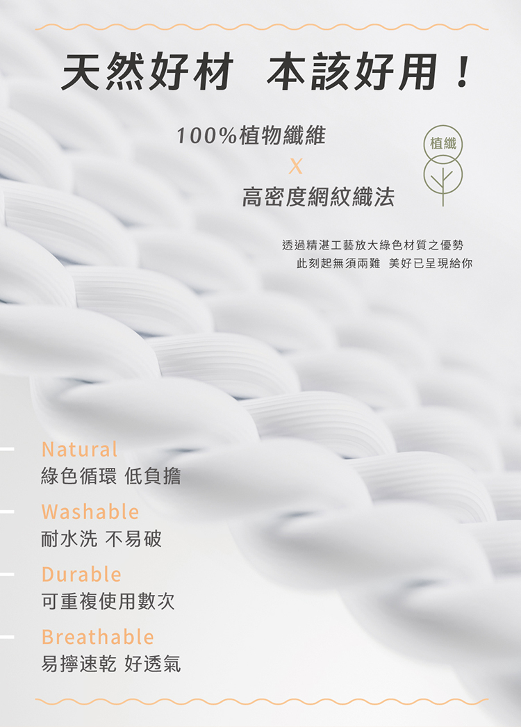 ◆ 易擰速乾、柔韌不易破,可水洗、可重複使用