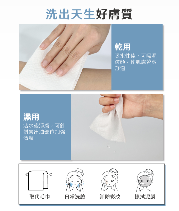 ◆ 取代毛巾,推薦當作洗臉/卸妝巾,亦可當作泥膜、凍膜、乳霜面膜擦拭巾